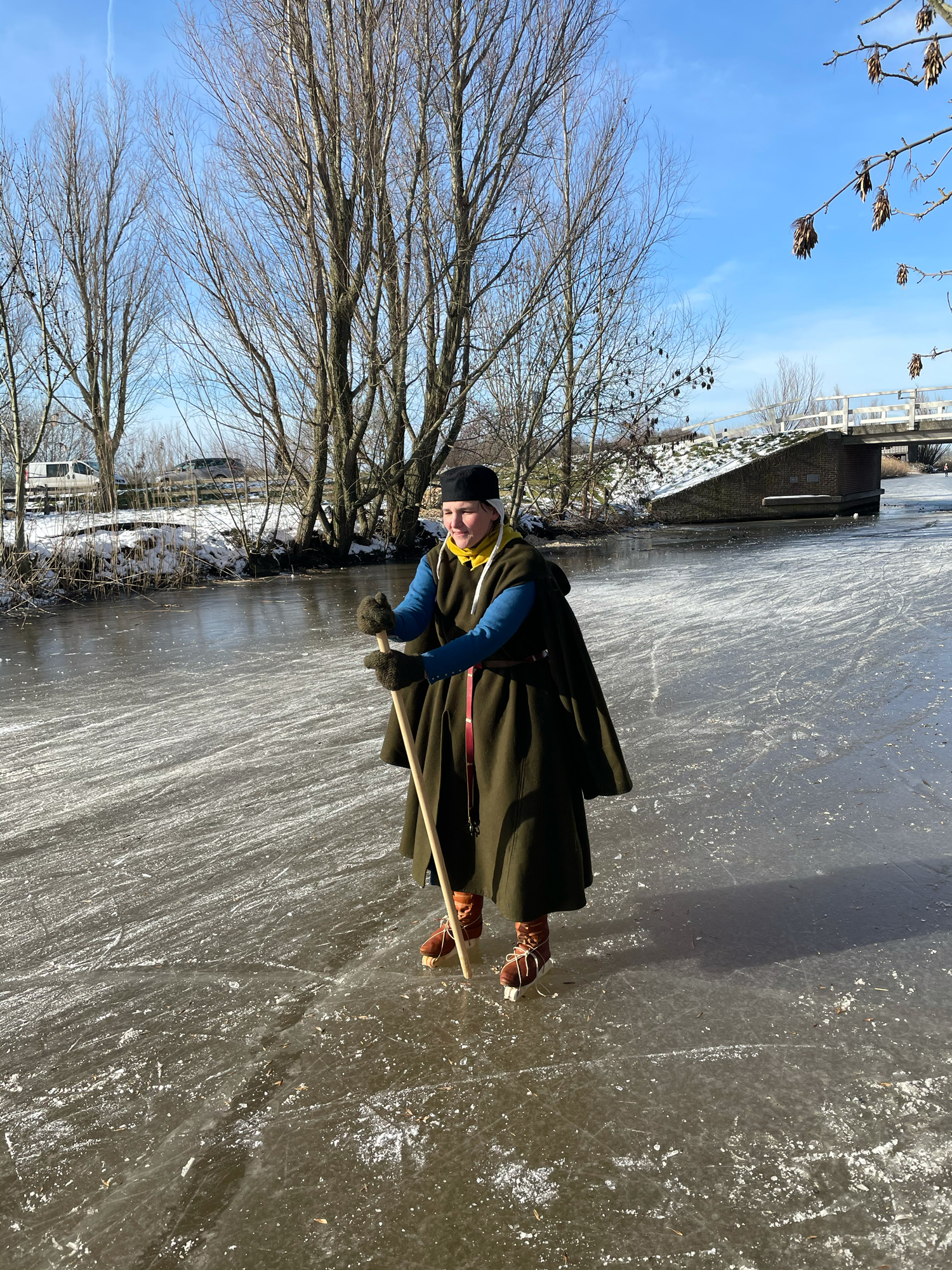 This starts about 5 years ago when I found bone runners on a website selling medieval replica’s. I instantly bought them with the idea that it would be really nice to glide on the ice in medieval attire. What I did not know was that for 5 years there would be no natural ice in the Netherlands. The bone runners were becoming dusty on my attic until February 2021. I have bound them under my shoes and went for it. Here I will write about this experience.
